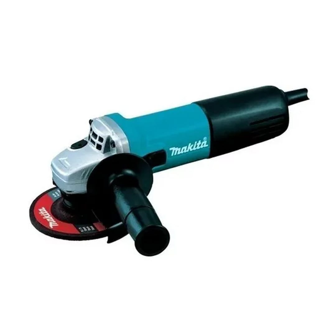 Miniesmeriladora Angular Makita con disco para realizar trabajos de desbaste y pulido profesional en metal y acero.