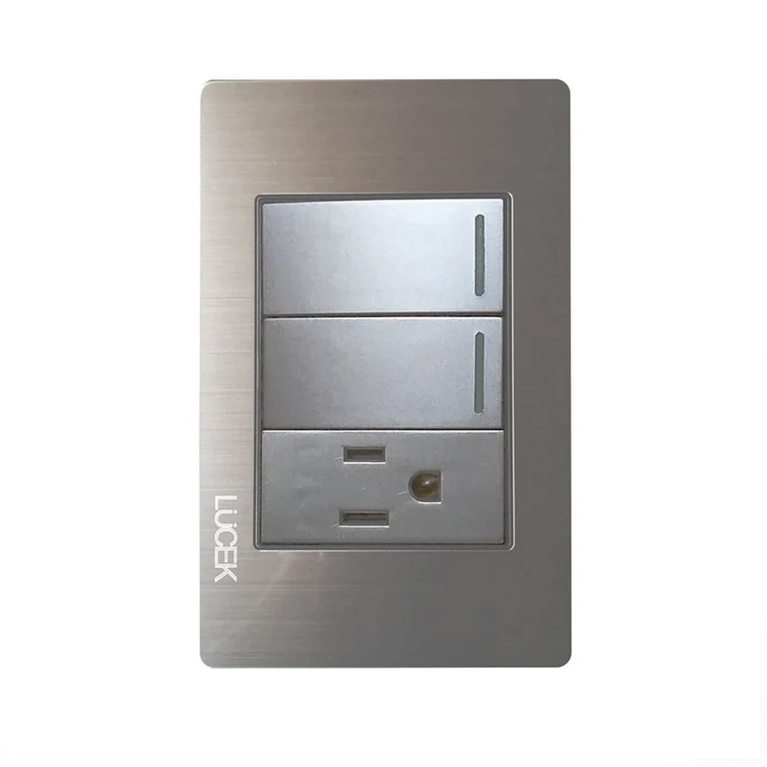 Placa metálica plateada de 3 módulos con dos apagadores sencillos y un contacto de 1 módulo anodizado. 127-250 v (apagador) 16 a (apagador) 110-250 v (contacto) 15 a (contacto).
